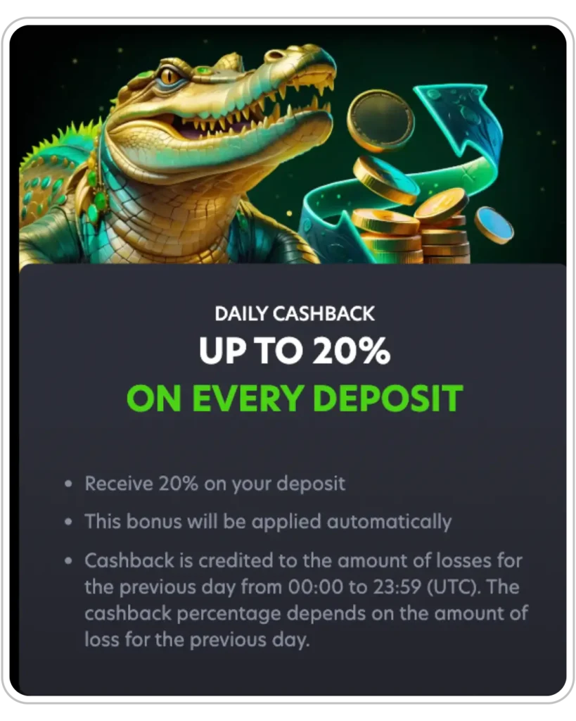 Our website offers 20% daily cashback to regular players in Australia. This means that you’ll be getting 20% of your total loss each day as a reward into your account. For context, if you lose 100 AUD on the day of your gambling adventure, you’ll get a cashback of 20 AUD at the end of the day.