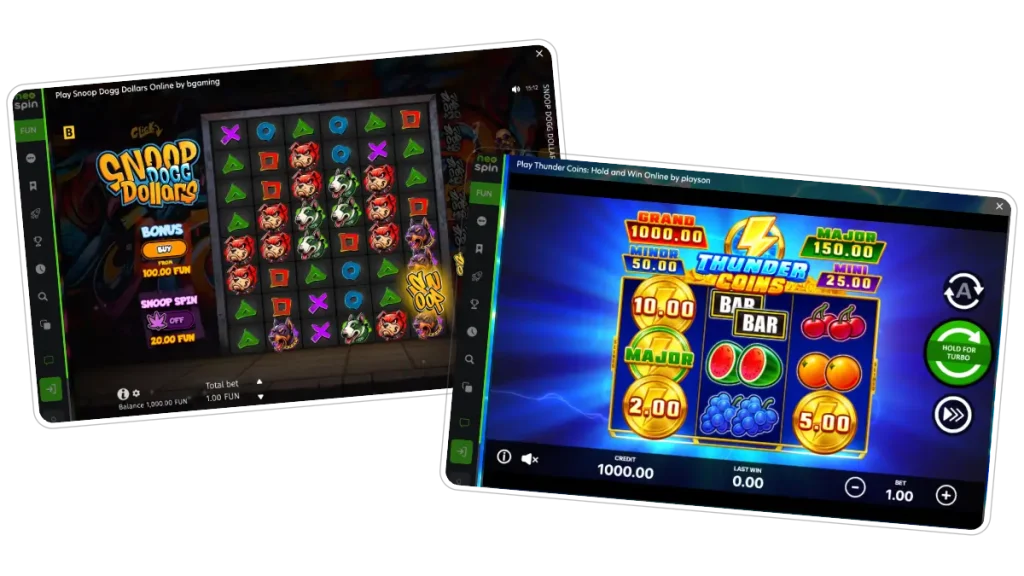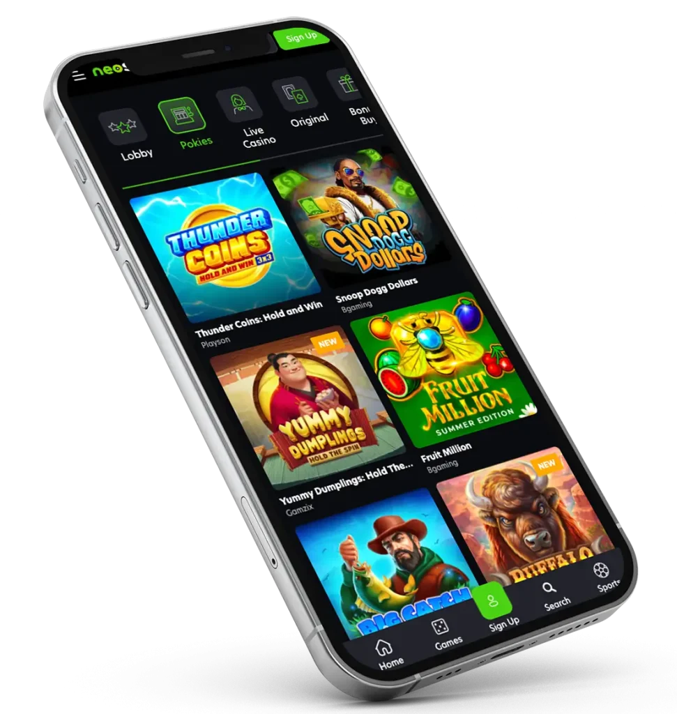NeoSpin Casino pokies have steadily grown in popularity among Australian players, rising to become one of the most sought-after gaming categories in the country. You can try such pokies as Thunder Coins: Hold and Win, Snoop Dogg Dollars, Big Catch Bonanza, Yummy Dumplings: Hold The Spin and more. The combination of top quality and sleek gaming experience from our titles sets the game apart from other titles as an engaging casino category for every player.