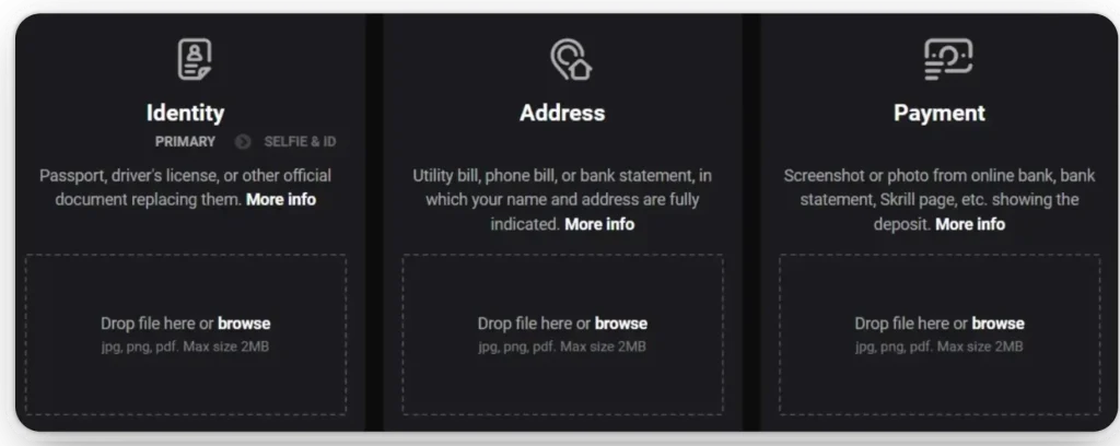 Honestly, we might not mind if this KYC process weren’t mandated by the regulators. It also makes your transaction, especially withdrawal, smooth and fast. Our team simplified the process because it takes no time. Once the files are in JPG, PNG or PDF with the size not exceeding 2MB, you’re good to go. The required documents are: